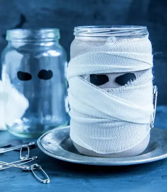 Samler det seg raskt opp glass hjemme hos deg? Enten det er barnematglass, syltetøy glass eller flasker – lag skumle mummier til Halloween og server drikke eller godis i glassene, eller sett et stearinlys i glassene og pynt opp til halloweenfesten.