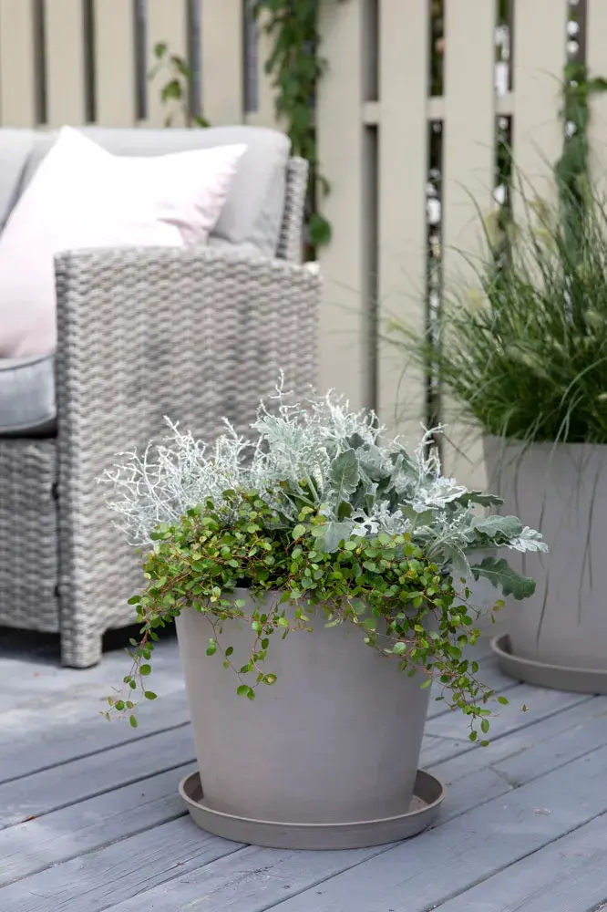 Sammen med de blomstrende plantene kan det være fint med noen grønne eller sølvfargede planter som sølvkrans, Muhelenbechia, Dichondra ‘Silver Falls’ og Calocephalus. Ulike sorter prydgress er veldig dekorative, og pyntekål er lekker med sine spennende bladformer. Lave nattetemperaturer gir pyntekålen den vakre fargeutviklingen, og den blir bare finere og finere utover høsten.