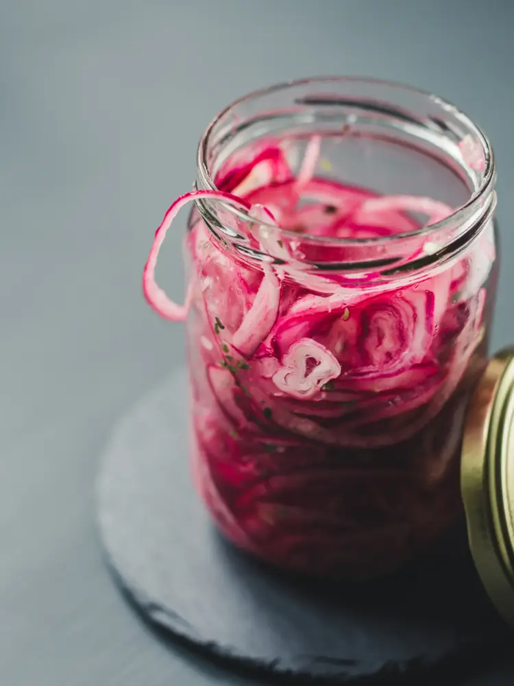 - Kok opp vann, sukker og eddik i en kasserolle. Legg i rødløk, pepperkorn og sennepsfrø når sukkeret har løst seg opp.