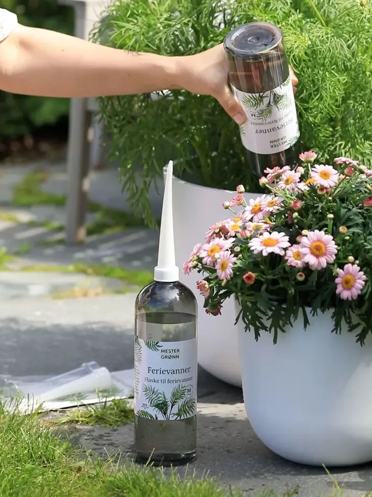 Mester Grønn sine ferievannere kan hjelpe til med å holde plantene friske og fine mens du er borte noen dager. Du kan velge mellom to ulike varianter, en i gjennomsiktig glass, og en pakke med fire ferievannere som kan festes på tomme brusflasker (passer ikke Coca cola sine nye flasker). Det første du må gjøre er å sette det som kan flyttes i så mye skygge som mulig, og vanne godt slik at jorden er fuktig. Så fyller du en flaske med vann, skrur ferievanneren på flasken og setter den på hodet oppi blomsterpotta.