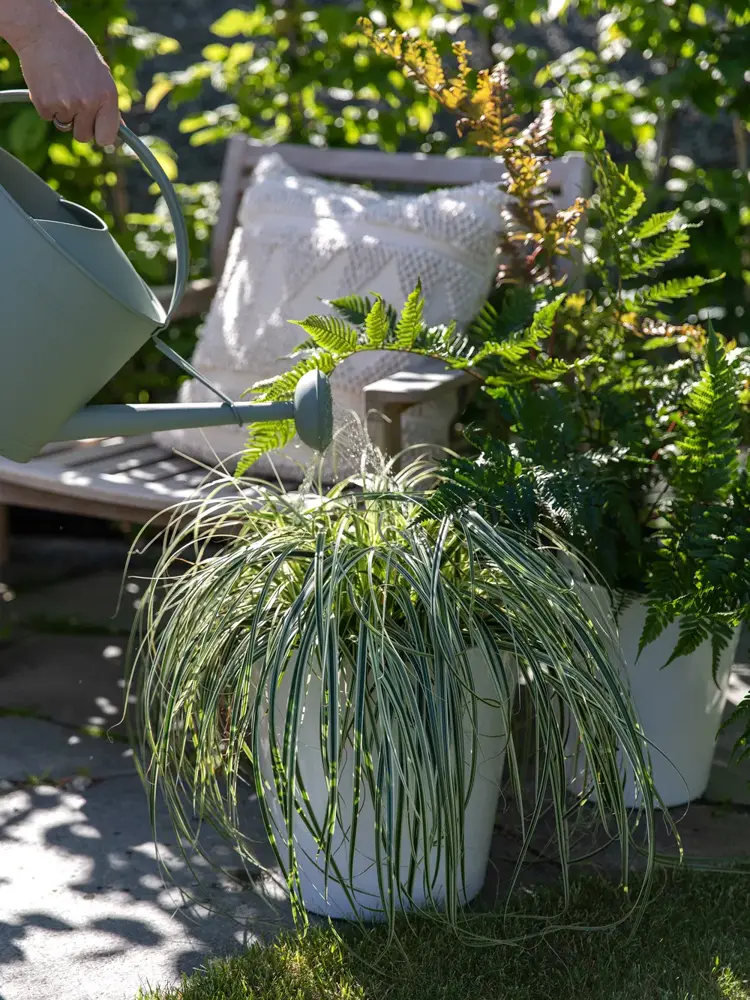 Plantene trekker ut så mye vann som de trenger selv fra ferievannerene, og skal du ikke være borte så alt for lenge, kan du komme hjem til en fortsatt blomstrende og fin uteplass.