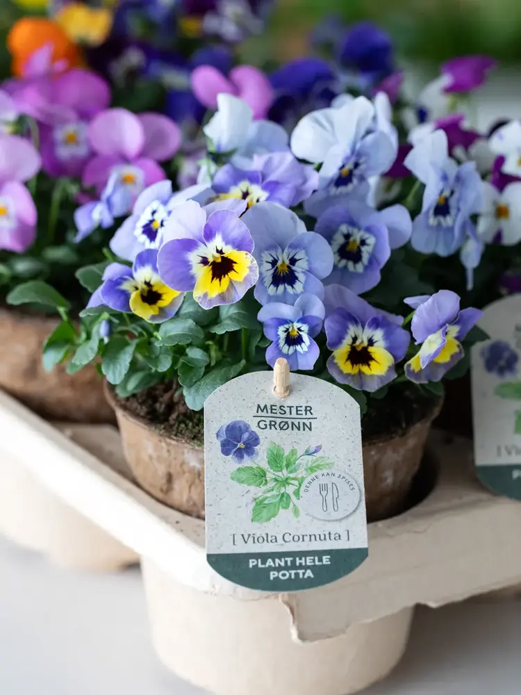 Hos Mester Grønn finner du viola som både er spiselig og bievennlig, og som kommer i plantebaserte og plastfrie potter som kan plantes rett i jorda.