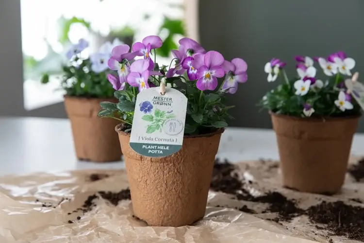 En annen positiv egenskap ved violaen du får kjøpt hos Mester Grønn, er at potten er både plantebasert og plastfri. Det vil si at hele produktet kan plantes, og vil løse seg opp i jorda over tid. NB! Det er viktig å klemme/knekke potta før du planter den.