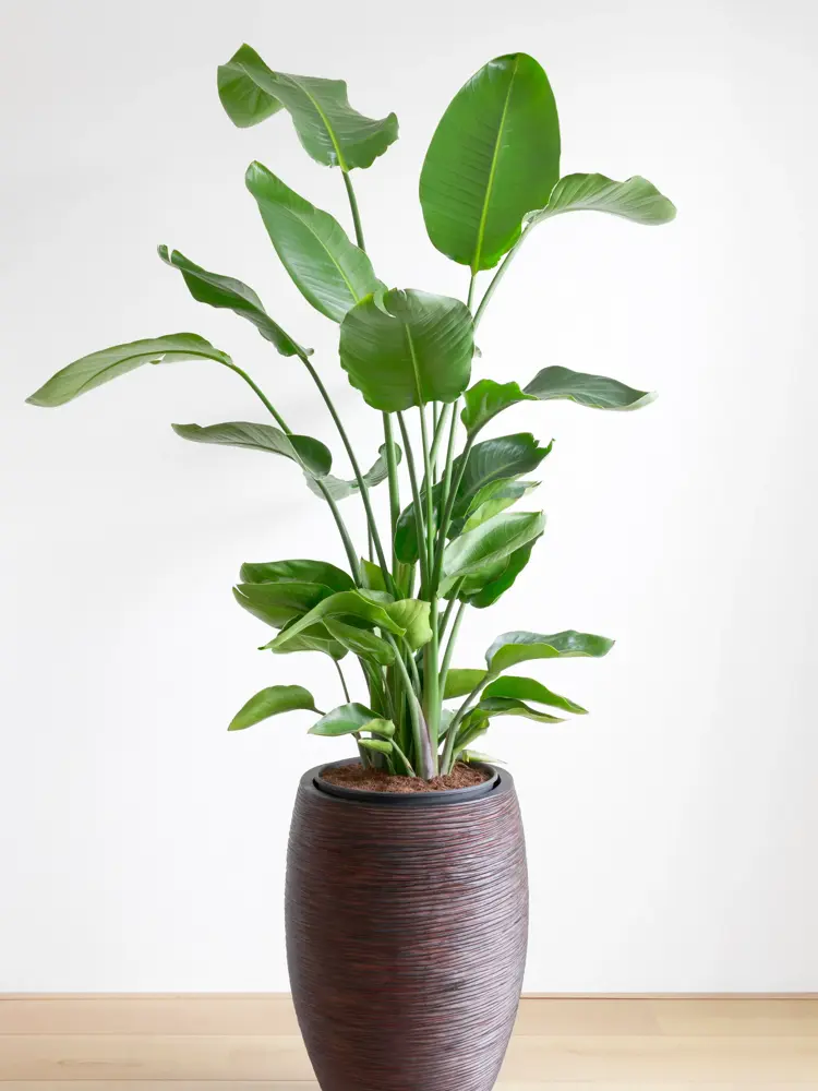 Strelitizia Nicolai er en relativt stor plante og trenger derfor en stor potte. Hva med å gå for en trendy stråkurv istedenfor den klassiske porselenspotten? Glasert keramikk er også i vinden dette året!