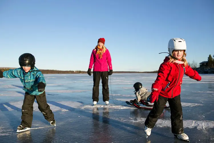 Skøyter blir vi aldri lei av, så gøy som det er å fyke over isen i full fart! En bruskasse eller lignende er fint å støtte seg til for nybegynnere, og bruk alltid hjelm. Pakk med dere kakao på termos, energibarer og sjokolade – og kanskje noen myke kanelsnurrer? Ekstra ullsokker er også et must til kalde tær etter en stund på isen.