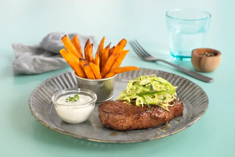 Ingenting er så hverdagsluksus som en biff. Server en saftig og mør biff sammen med sprø søtpotetchips, en frisk squashsalat og litt rømmedressing.