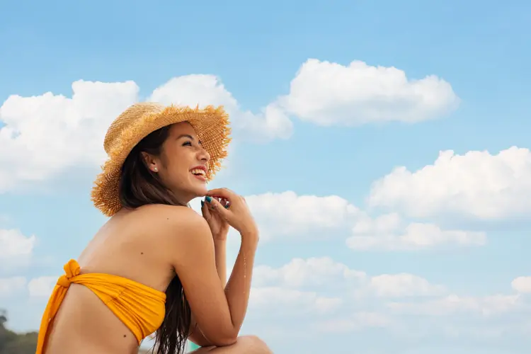 Et trendy magesmykke setter en festlig prikk over i-en for strandantrekket, og kan fint kombineres med bikinien både morgen og kveld. Tanktops, en stor hatt, og store sofistikerte – eller smale – solbriller er også et must i strandkofferten. Gå for et par solbriller du liker godt, ettersom at de mest sannsynlig kommer til å være på nesen 90 prosent av ferien.