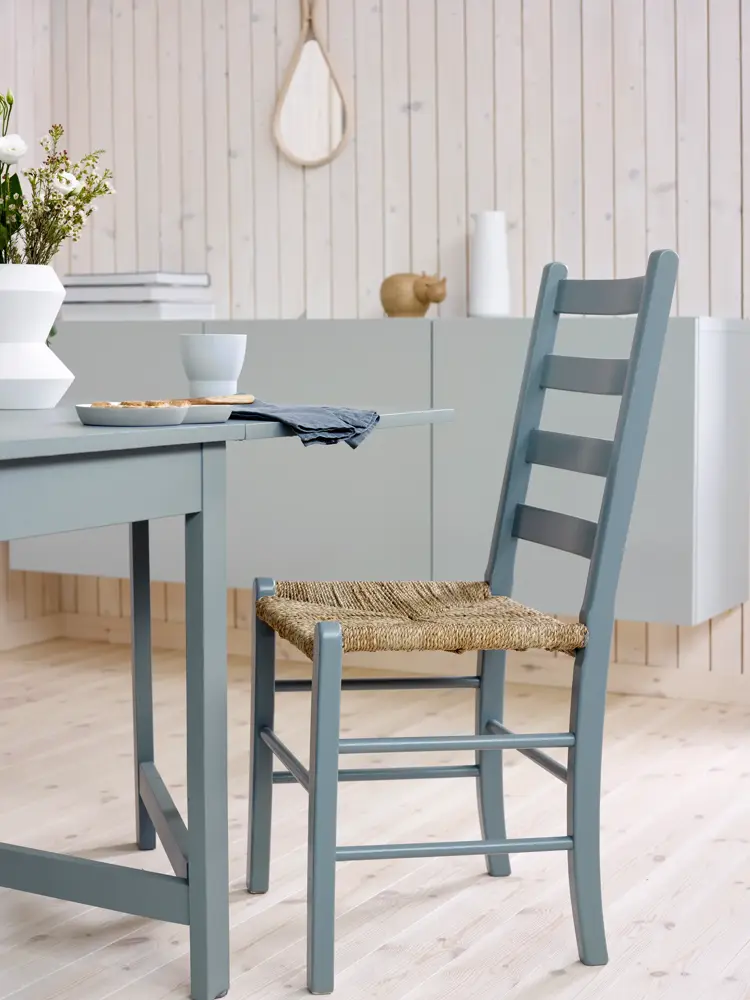 Til venstre: Sett farge på andre ting enn veggene. Å male et bord eller stoler er en flott måte å bruke farger på. Malt med Lady Supreme Finish 5490 Serene. Foto: Jotun. Til høyre: Bruk grønne planter til å få inn litt farger i hjemmet på.