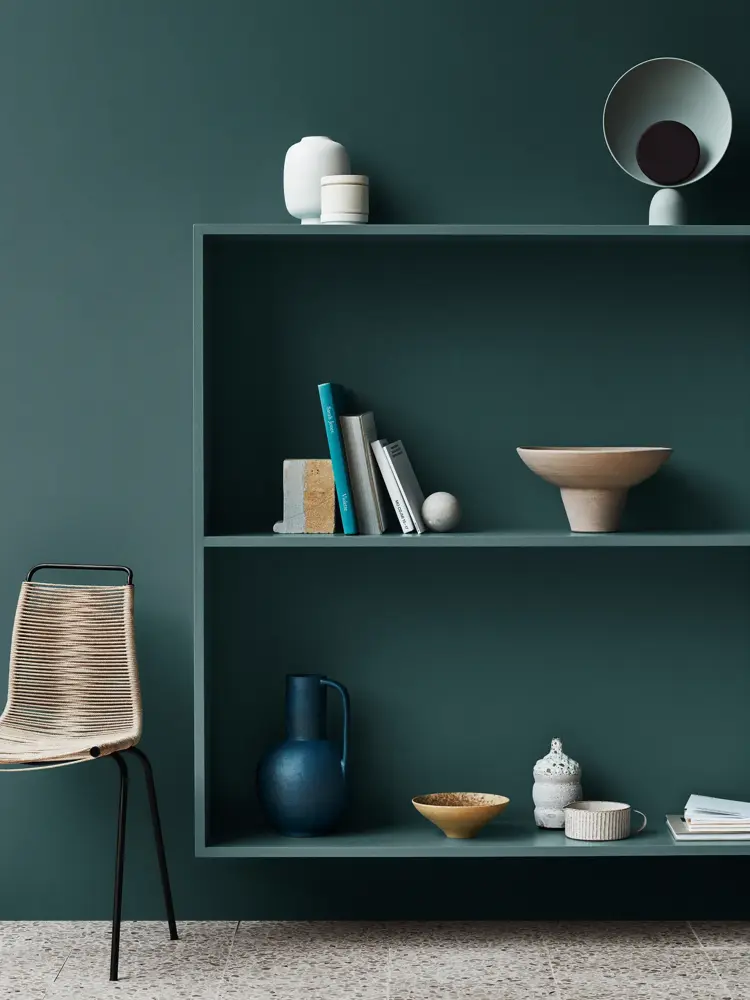Fargen Free Spirit fra Jotun er en perfekt balanse av grønt og blått. Vegg er malt med Lady Wonderwall 5489 Free Spirit, hyller med Lady Supreme Finish 5489 Free Spirit. Foto: Jotun