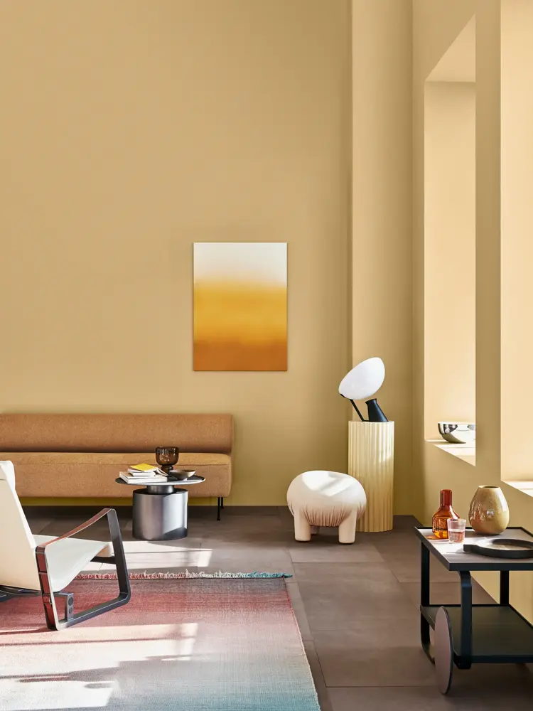 Fargen Velvet fra Jotun er en lun, dempet og tydelig gulfarge som passer perfekt i stua. Kombiner den med dypere farger som Mellow eller Natural Clay fra Jotun. Vegg er malt i Lady Pure Color i fargen Jotun 10246 Velvet. Foto: Jotun.