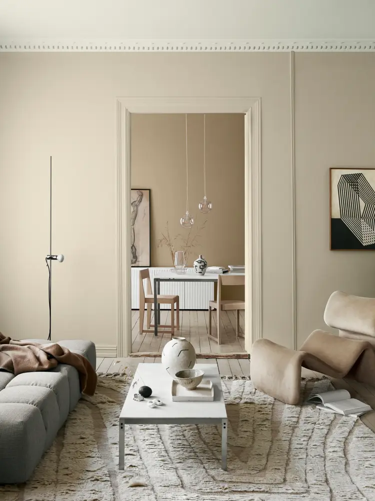 Hvem har sagt at nøytrale farger trenger å være kjedelige? Nøytrale farger som hvit, brun og beige oppleves ofte som myke og behagelige farger, og kommer i uendelige varianter. Velg mellom svale hvitnyanser eller lune toner i brunt og beige. Kombiner det med enkle og klassiske møbler i naturmaterialer som tre, skinn eller betong, og gå gjerne for ton-i-ton dersom du ønsket et mykere uttrykk. Et tips er å male bokhyller eller andre hyller i samme farge som veggen.