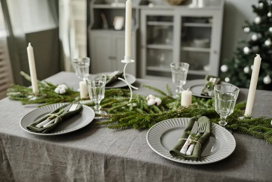 Tallerkener og dekketøy kan holdes i lyse toner som hvit og lys beige, bruk linservietter og -duk og pynt med granbar og grener.