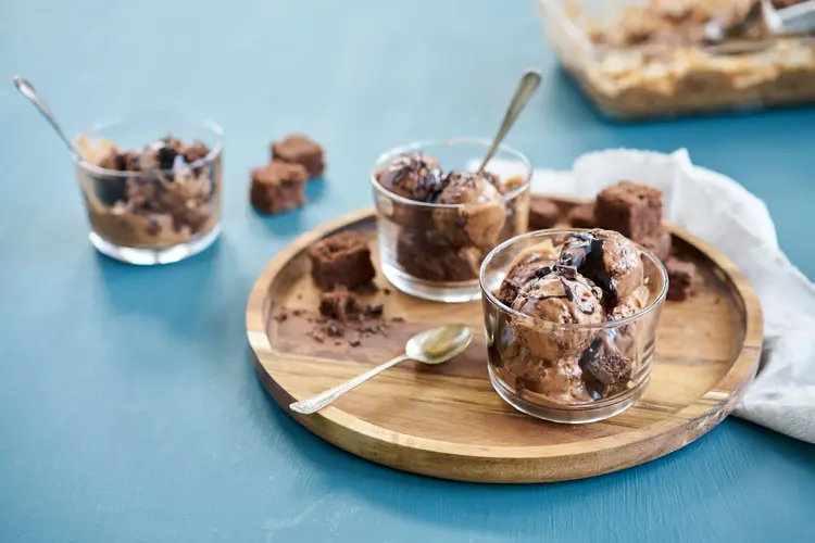 La isen bli temperert og myk i kjøleskapet i ca. 20 minutter før du serverer den. Server gjerne med biter av brownies og en deilig sjokoladesaus.