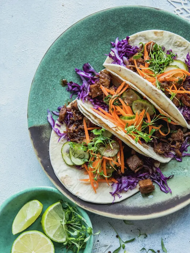 - Anrett tacolefsene med rødkål, glasert ribbe, syltede grønnsaker og pynt eventuelt med friske spirer eller frisk koriander. Server gjerne noen limebåter til.