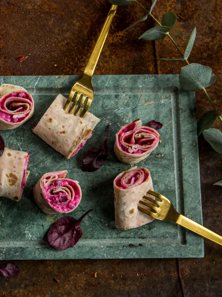 - Fordel rødbetsalat på lefsene og legg på skiver av lammerull.
