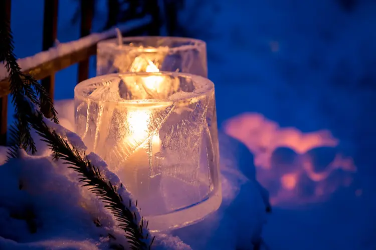 Candles placed inside the ice and snow, emitting beuatiful orange glow in darkening evening.
