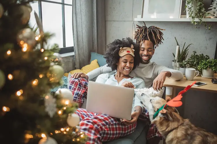 Par og hund ser på film i en julepyntet stue