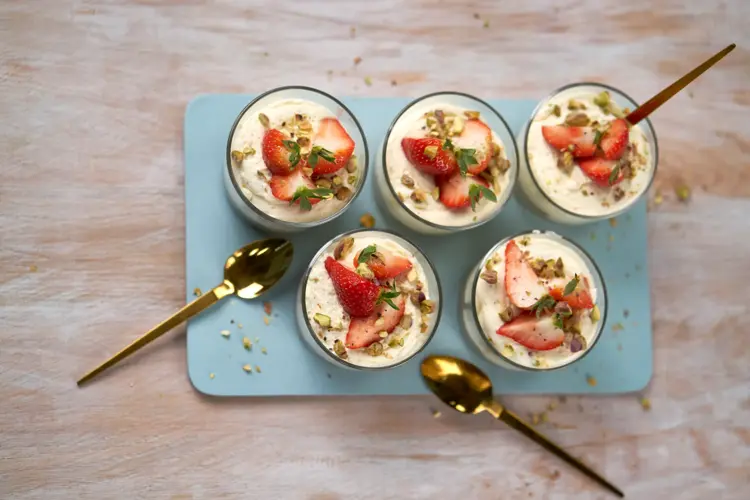- Skjær jordbær i båter og pynt de små ostekakene. Dryss gjerne litt grovhakkede pistasjnøtter over til pynt.