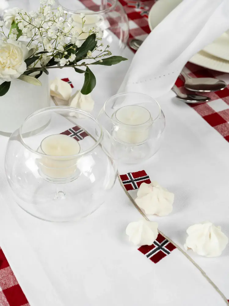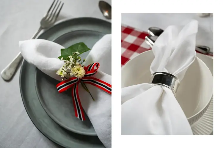 Linservietter gjør bordet ekstra elegant og fungerer også som et dekorativt element når du bruker serviettringer eller bånd til å binde de opp. Grønne grener kan brukes som pynt på bordet og gjerne sammen med en flagglenke. Stearinlys og kubbelys i rødt, hvitt og blått er med på å skape et feststemt bord.