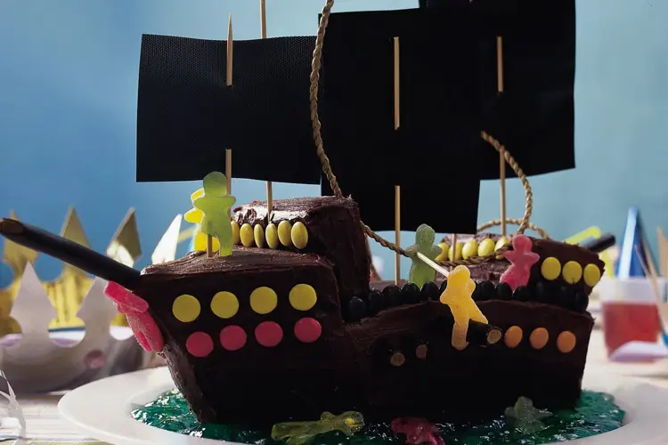 - Dekk hele skuta med sjørøverkrem. Tre seilene på trespyd og pynt skuta som bildet foreslår. Anrett geleen som vann rundt skuta.