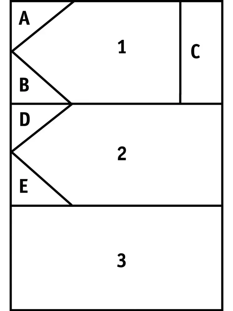 - Del kaken i tre lengder (se bilde). Skjær av to trekanter (A og B) foran på del 1 og en 5 cm lang bit bak (C).