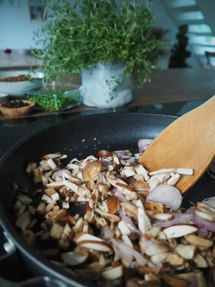 2. Stek soppen og løk i litt matolje. Stek på høy varme til de får en gyldenbrun farge.