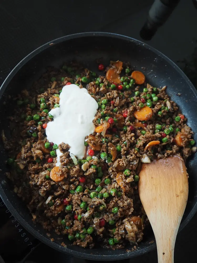 3. Tilsett A La Kjøttdeig (eller Pulled Vegme), knuste einebær, timian og kraft og la det hele koke i cirka 10 minutter.