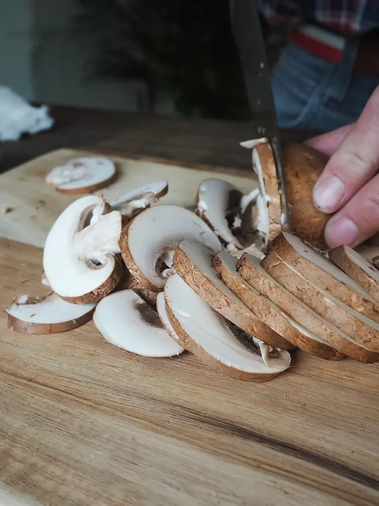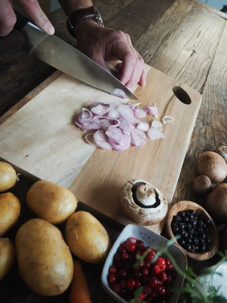 1. Start med å grovkutte gulrøttene og soppen, finkutt deretter sjalottløk i små biter.