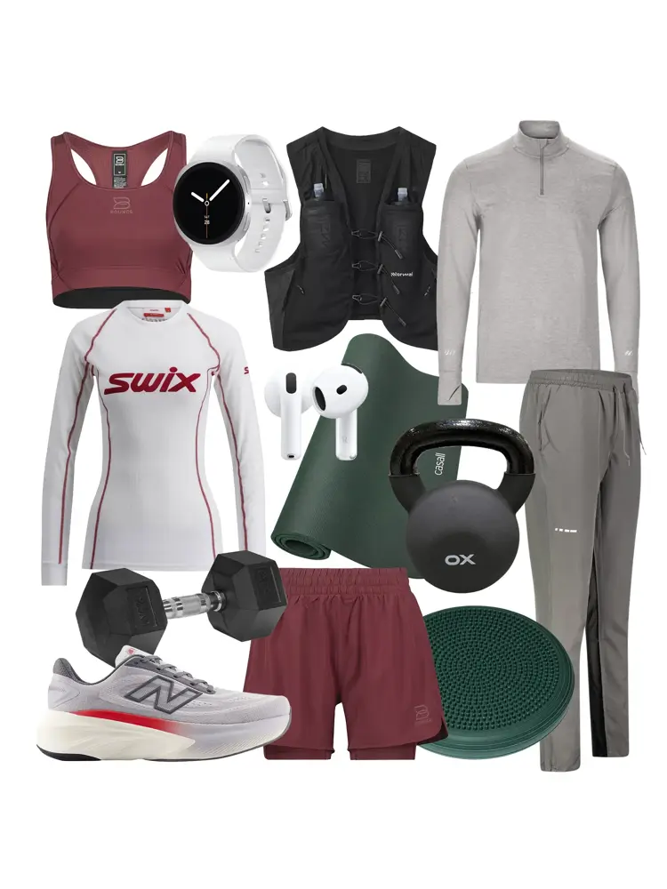 Sportsbh, Bounce XXL 399,- / Smartklokke, Samsung Telia 5090,- / Løpevest Platou Sport 1650,- / Genser Sport Outlet 295,- / Superundertøy, Swix Anton Sport 599,- / AirPod 4, Apple Telenorbutikken 1790,- / Treningsmatte, Casall Anton Sport 999,- / Kettlebell 10kg Sport Outlet 400,- Løpesko herre, New Balance XXL 1899,- / Frivekt Sport Outlet 75,- Shorts, Bounce XXL 499,- / Balansepute Anton Sport 399,- / Treningsbukse XXL 249,-