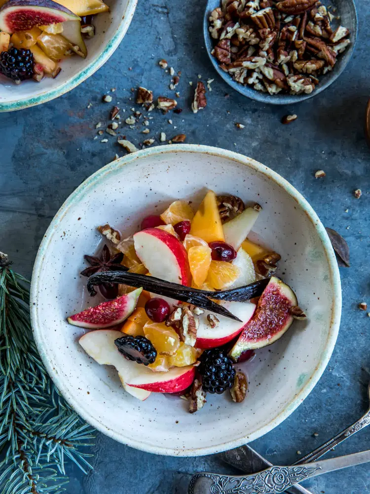 En frisk og fargerik fruktsalat er ofte den perfekte avslutningen på et godt måltid. Med frukt og krydder som fiken, klementiner, røde epler, kanel og stjerneanis får fruktsalaten en smak av jul.