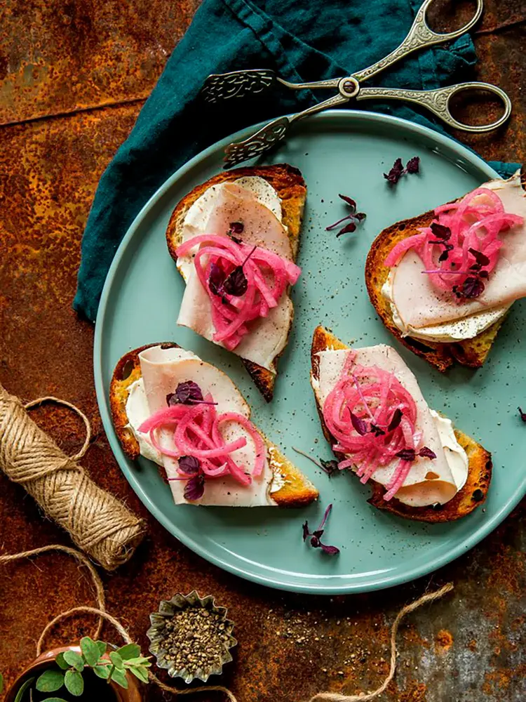 - Smør skivene med kremost, legg på juleskinke og topp med rødløk. Pynt gjerne med spirer og nykvernet pepper.