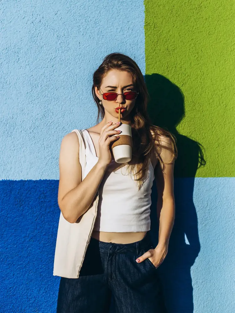 – Style den med en jeans med en kul detalj, for eksempel et mønster langs benet eller kontraster av en annen denim-tone, og topp antrekket med et par solbriller og røde lepper!