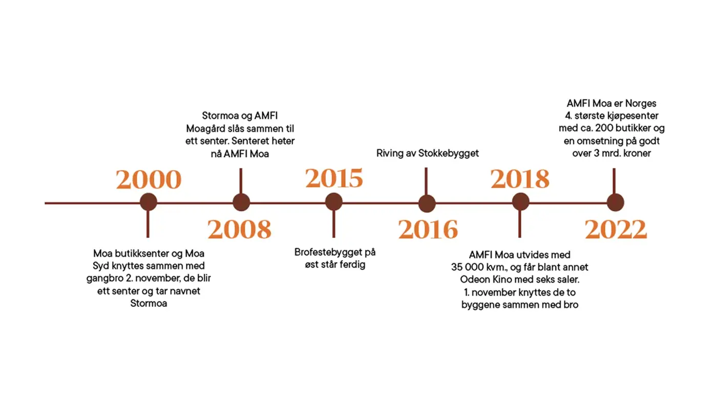 Utviklingen av Moa som handelsdestinasjon har vært enorm siden starten i 1972, og senteret er bygget ut i mange etapper. I jubileumsåret hviler vi heller ikke på laurbærene, og allerede i januar i år ble nok en utbygging påbegynt. Det skjer kort og godt alltid noe spennende og nytt på AMFI Moa.