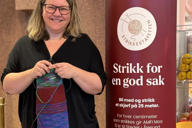 For hver centimeter som ble strikket, ga AMFI Moa kr 10,- til Stedet i Ålesund.