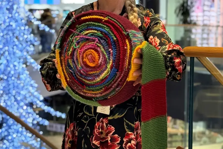 "Sett deg ned på standen utenfor Hjertestrikk og strikk så mye du vil og har tid til. Målet er å strikke et skjerf på 25 meter, og vi håper så mange som mulig vil bli med og strikke en omgang eller ti. Sett deg ned og ta pinnene fatt så kommer vi i mål sammen."
