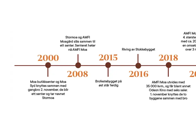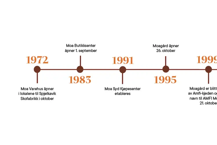 Utviklingen av Moa som handelsdestinasjon har vært enorm siden starten i 1972, og senteret er bygget ut i mange etapper. I jubileumsåret hviler vi heller ikke på laurbærene, og allerede i januar i år ble nok en utbygging påbegynt. Det skjer kort og godt alltid noe spennende og nytt på AMFI Moa.