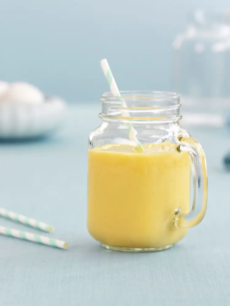- Ha banan, appelsinjuice, mango og egg i en hurtigmikser eller smoothiemaskin.