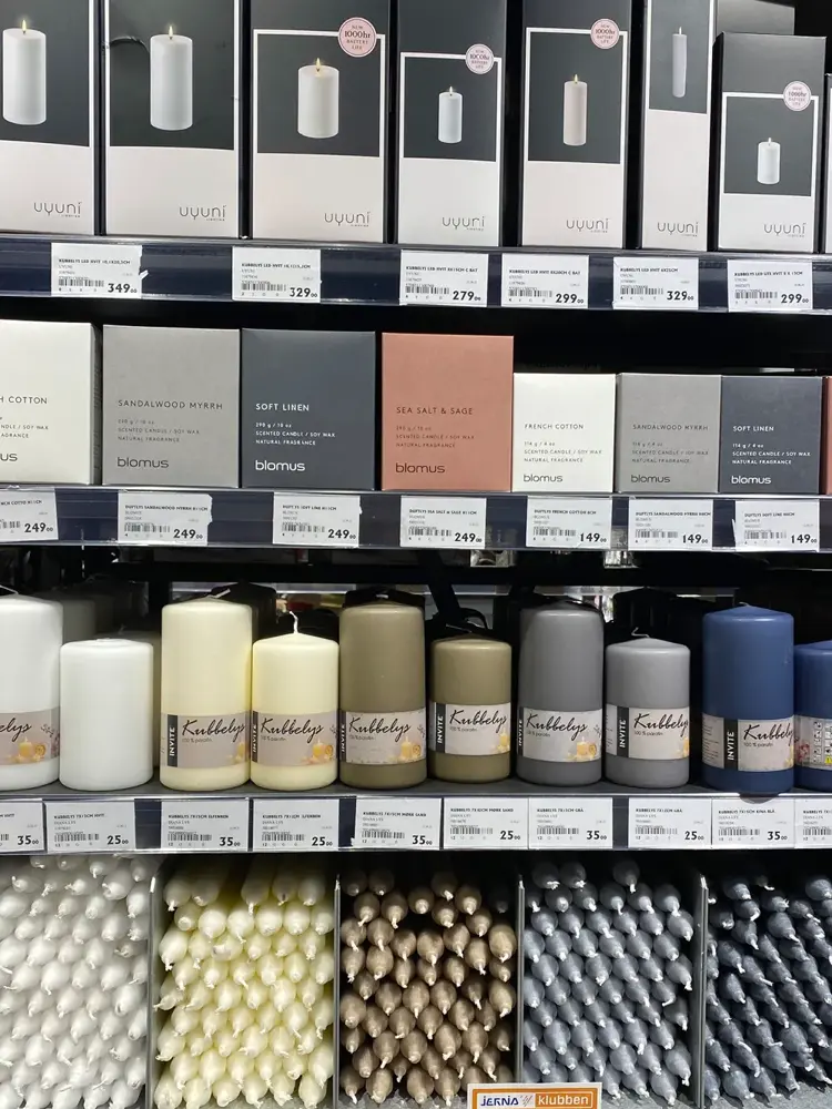 I hyllene på Rema 1000 Namsos har de alt fra lykter og duftlys til enkle kubbelys, kronelys og telys.
