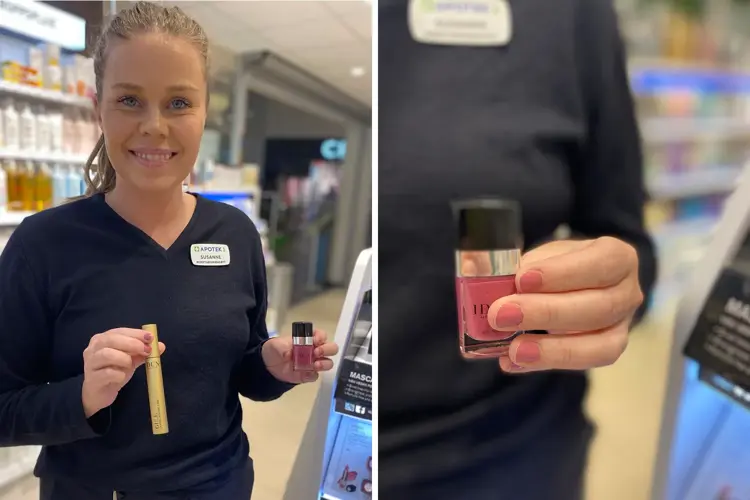 Hos Apotek 1 går det mest i Idun Minerals. Idun Minerals er en svensk sminkeserie som består av rene mineraler. Produktene gir næring og beskytter både hud og negler. Susanne har på seg neglelakkfargen «Rodonit». Hun bruker også Mascaraen i gull som gir økt volum!