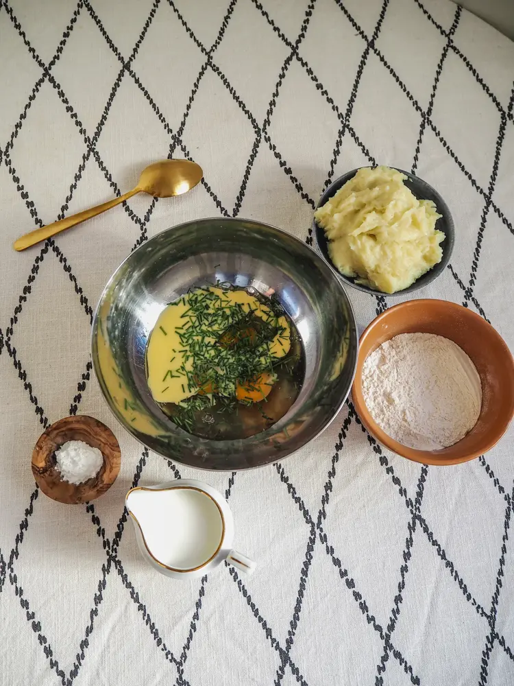 - Kok potetene, skrell og mos dem. Ha potetmosen over i en bolle.