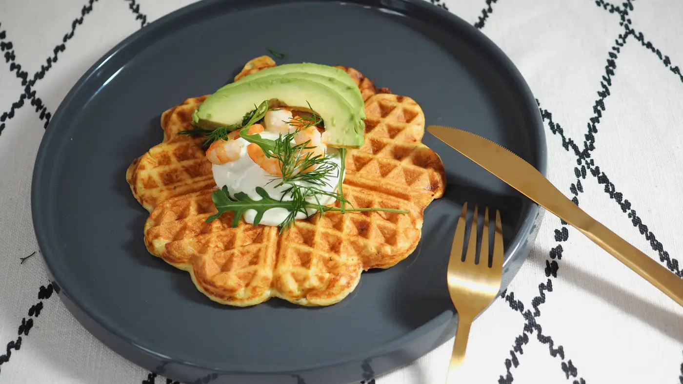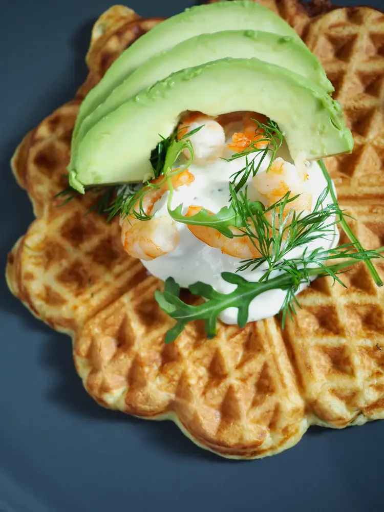 Topp vaflene med ønsket topping, som for eksempel rekesalat med avocado.