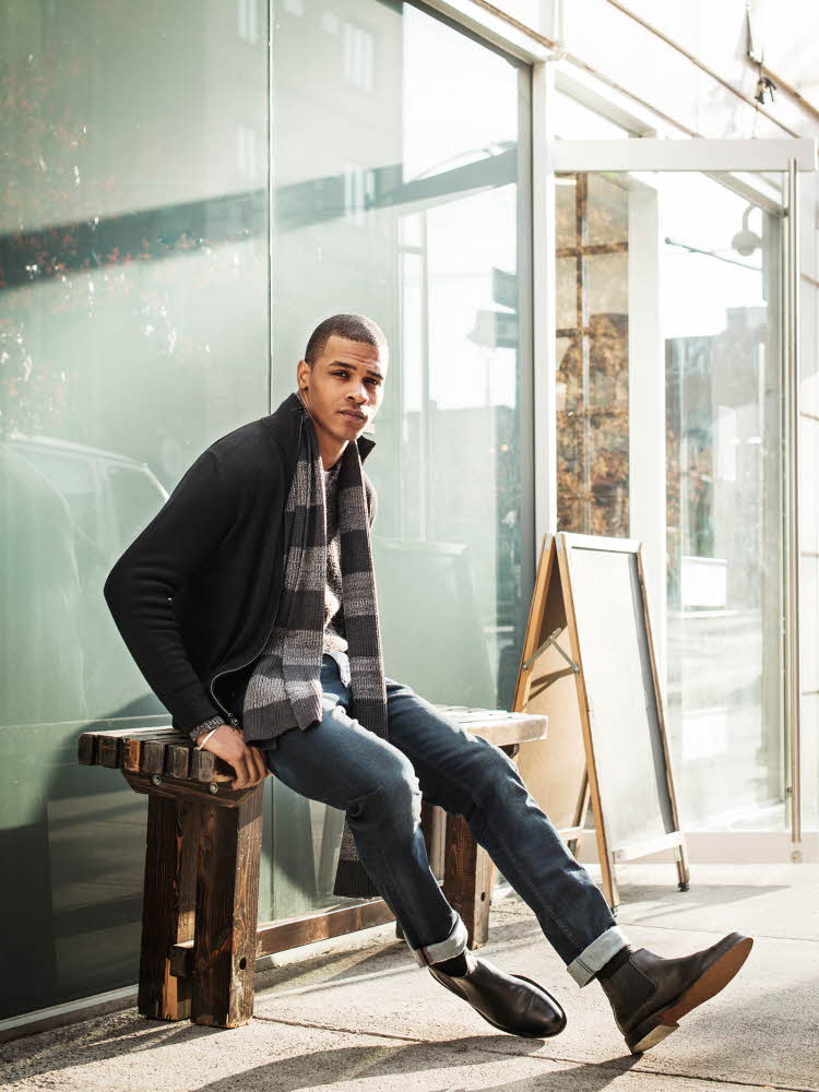 Mann med sort jakke, gråstripete skjerf, jeans og sorte chelseaboots sitter på benk foran glassfasade og ser i kamera