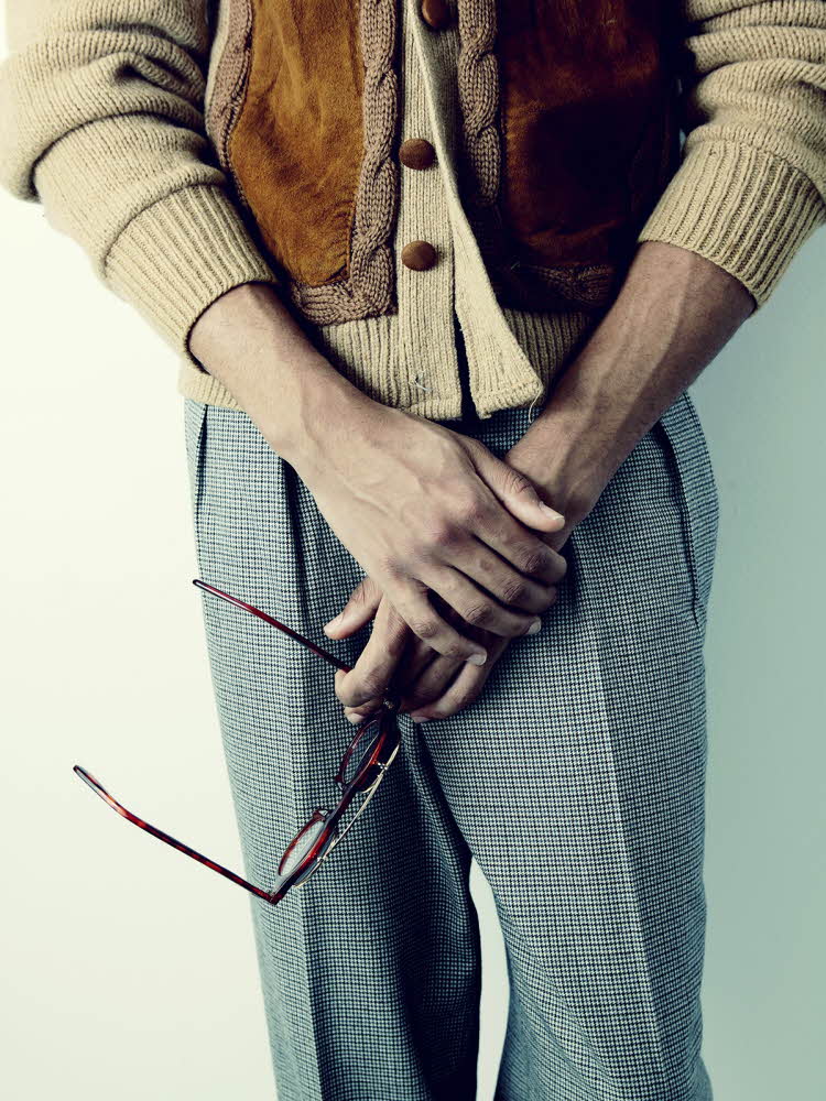 Nærbilde av mannehender som holder briller med rutete dressbukse og beige cardigan