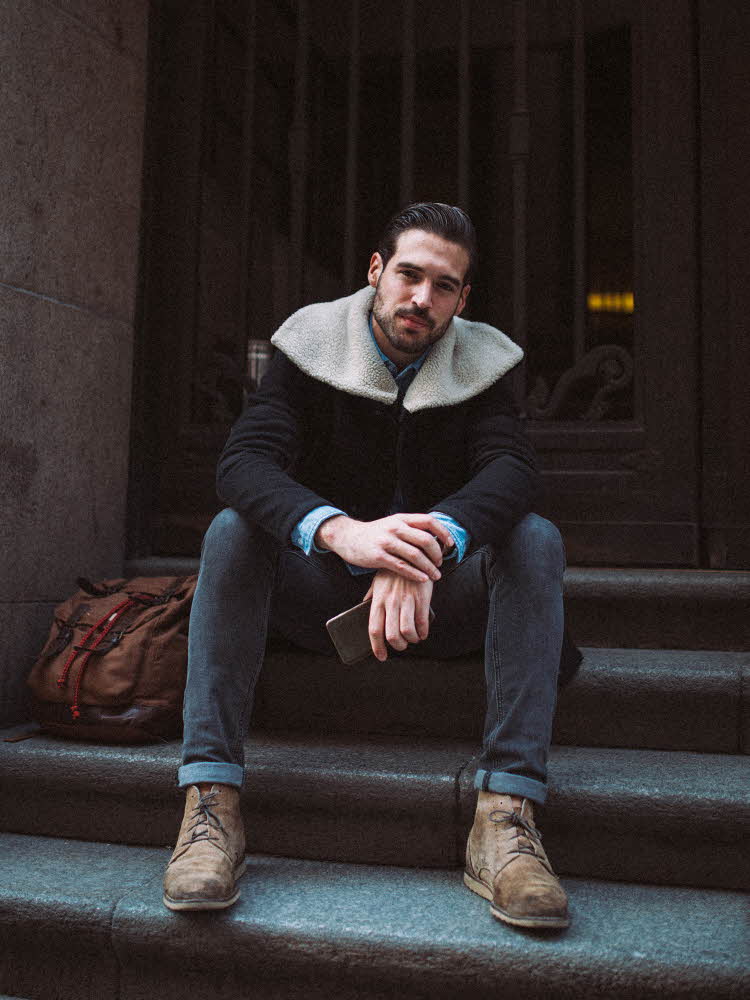 Mann med jakke med foret krage sitter på trapp utendørs og poserer for kamera