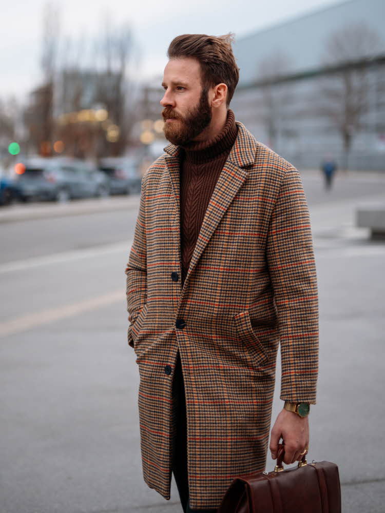 Mann med brun og rødrutete frakk og brun høyhalset genser poserer utendørs med brun skinnveske