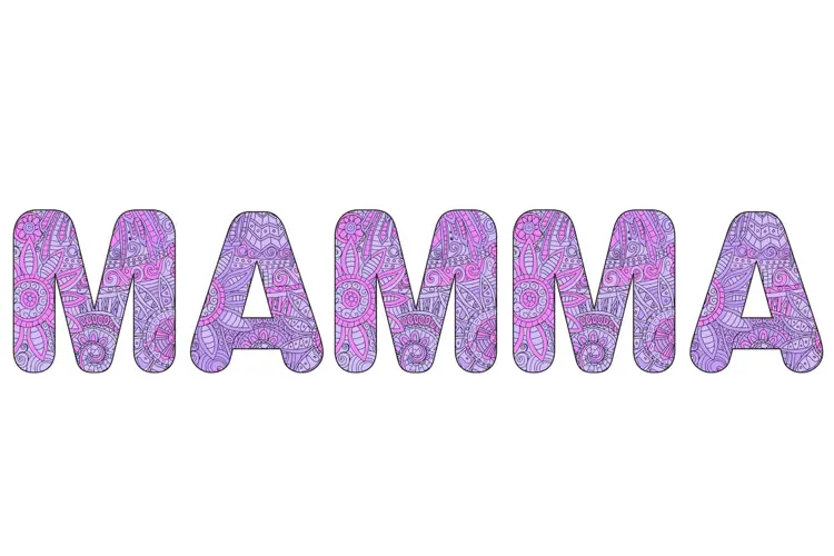 Mønstrede bokstaver fargelagt i lilla hvor det står MAMMA