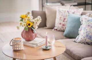 Stue med lun atmosfære og sofa med puter i høstlige farger og trebord med stearinlys i front