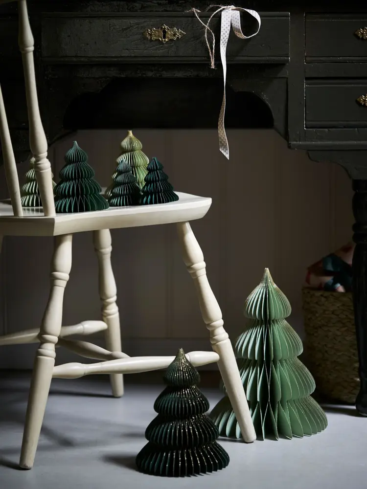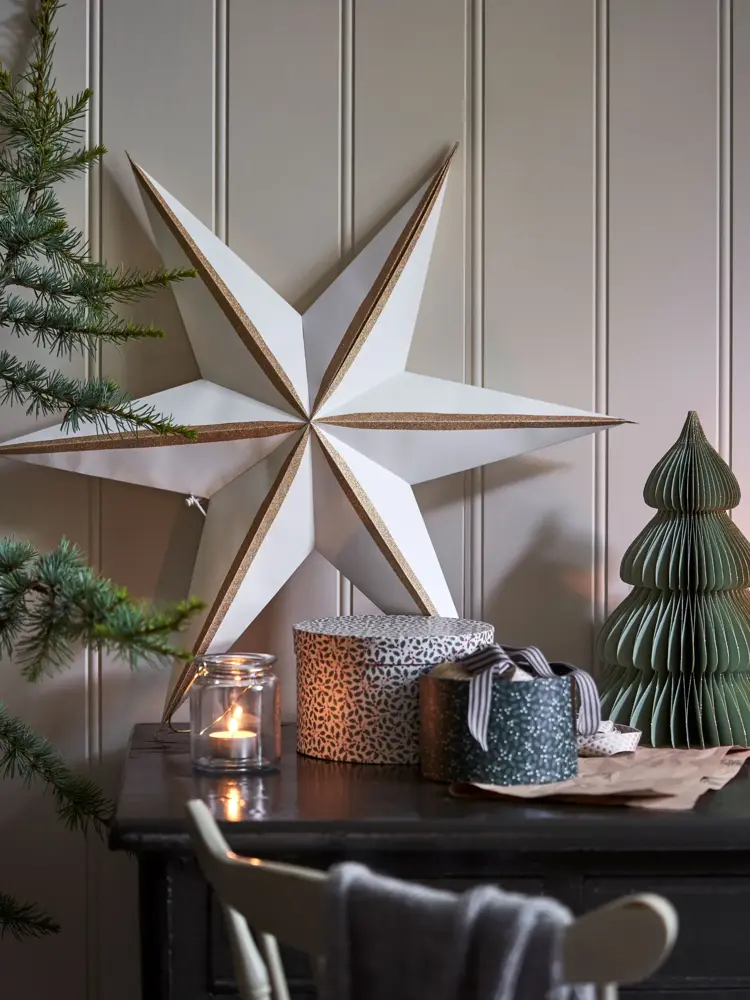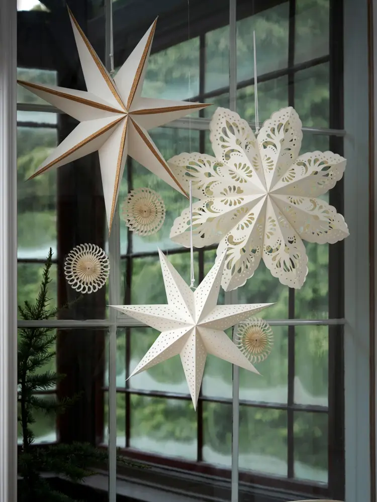 De siste årene har papirpynten blitt populær til jul, du finner den i alle mulige farger og fasonger. De fine papirstjernene kan du fint henge flere sammen i et vindu, eller hvorfor ikke plasser de på en skjenk sammen med noen av papirjuletrærne.
