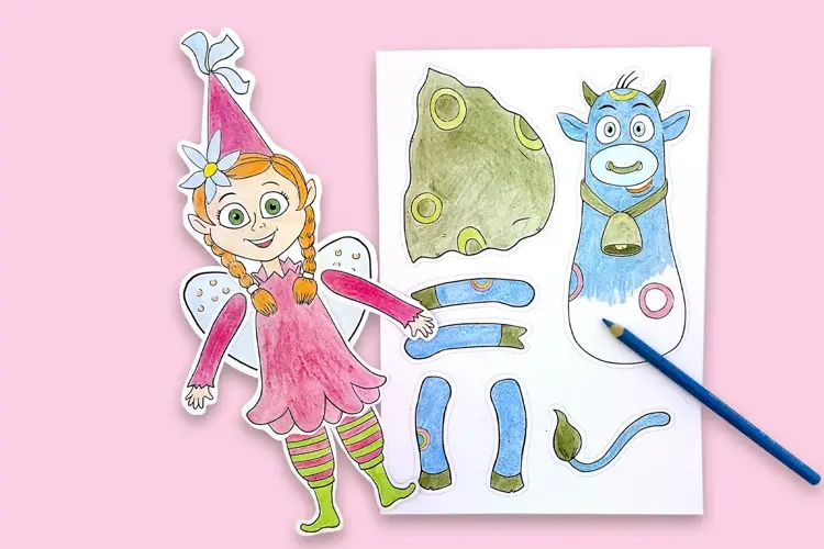 - Når delene er ferdig fargelagt og klippet ut, limer du dem sammen. Hvis du vil ha stødigere figurer, kan du klippe ut det samme omrisset i papp og lime det på baksiden for ekstra støtte.