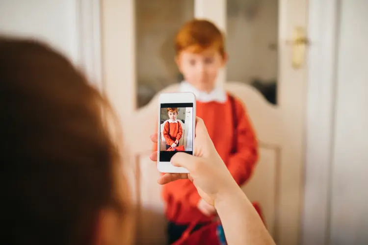 Little boy dressed for his first day back to school, having his photo taken by his Mother on her smartphone.